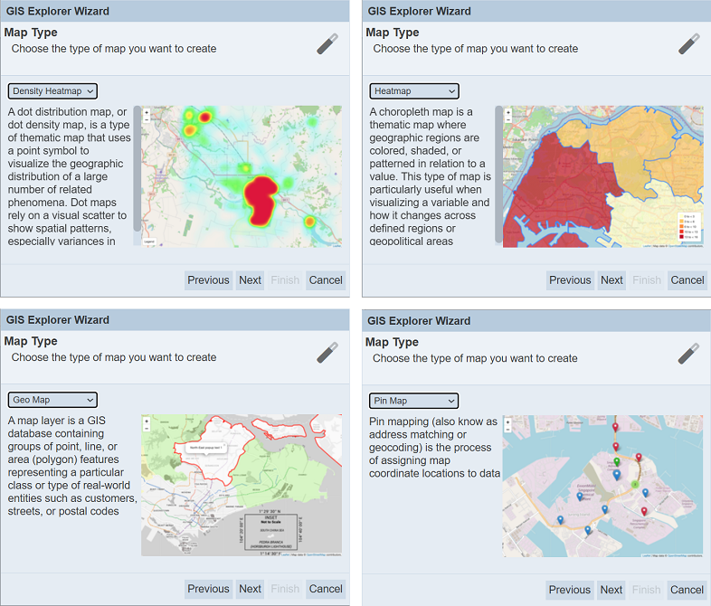 Do note that different maps selected will prompt different sets of fields and pages. All maps except Geo Map requires a dataset. These datasets require specific fields. See GIS Datasets for more details.