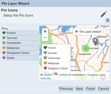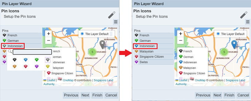 Select the desired colour and the GIS view will change according to the selection. In this case, “Indonesian” pin icon is changed from grey to blue.
