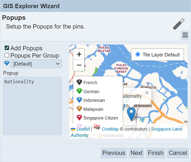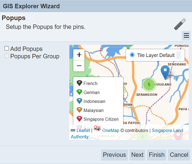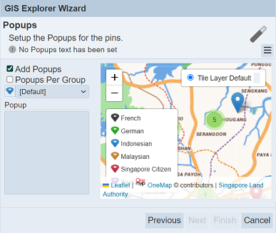 In this mode, a generalised pop-up can be created for the pin icons. Which means all pin icons will use the text keyed into the “Popup” textbox. To customise a pop-up for each group, select the “Popup Per Group” field. This will allow a different pop-up text for each group. To do so, select a group from the drop-down list and key in the desired text in the “Popup” textbox.