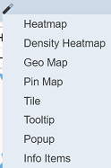 The options can be divided into two option types. The first five maps/tile layer options allows you to add new map/tile layers. The last three options (i.e., tooltip, popup and info items) allows you to delete or update existing selected option.