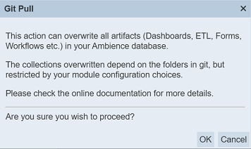 To pull the artifacts from Git, select the desired repository, branch or tag from their respective drop-down list and click on the “Pull from Git” button. The “Git Pull” dialog box will appear, warning on the consequences of the action.