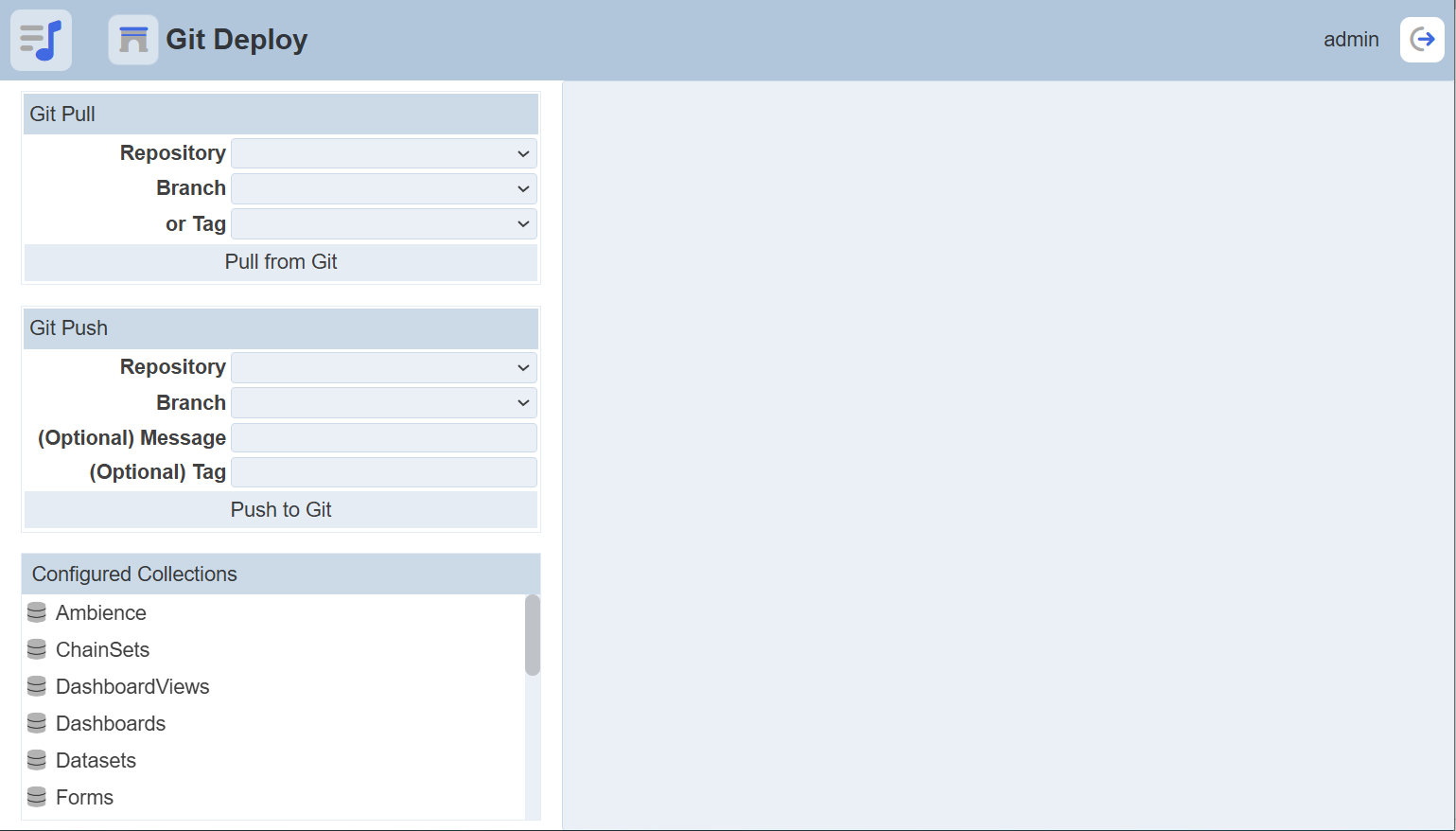 The Git Deploy module allows you to store, share and version control your artifacts in Git. Using version control means that it is easy to see what chainsets, dashboards, and forms etc. were changed and even what lines in the file were changed and when.
