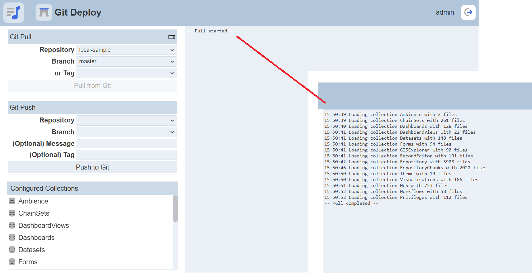 A corresponding Git Pull can be used to load the collections ready for testing or use. Do note that Git Pull is destructive. It will replace any collections found in the Git repository bt will not touch any collection that is not in Git.