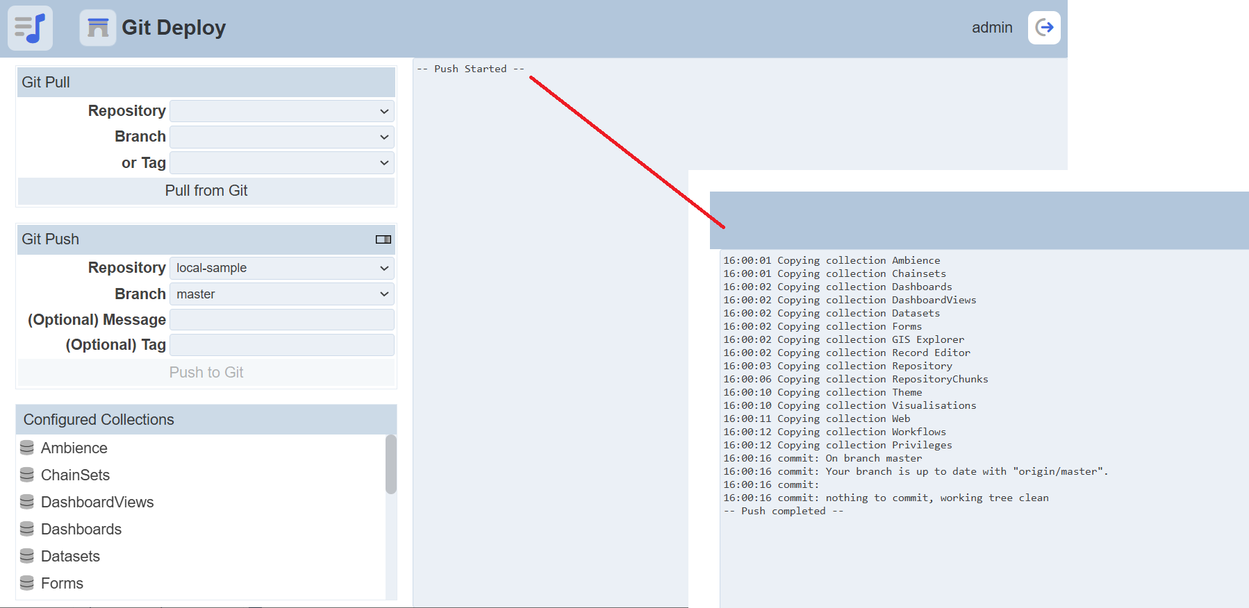 Once the button is clicked, the push progress will start. The progress status will appear in the right of the page.