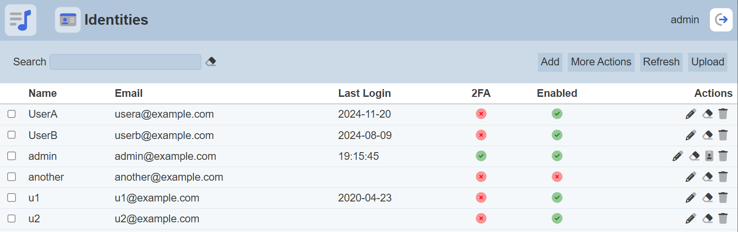 The Identities module provides a simple interface to manage user identities. Once the user identity has been created, it can be assigned roles and privileges through the Users module. The Identities module also allows you to enable or disable, edit details and reset the password of a user, as well as resetting their Two Factor Authentication (2FA).