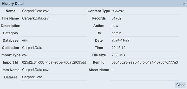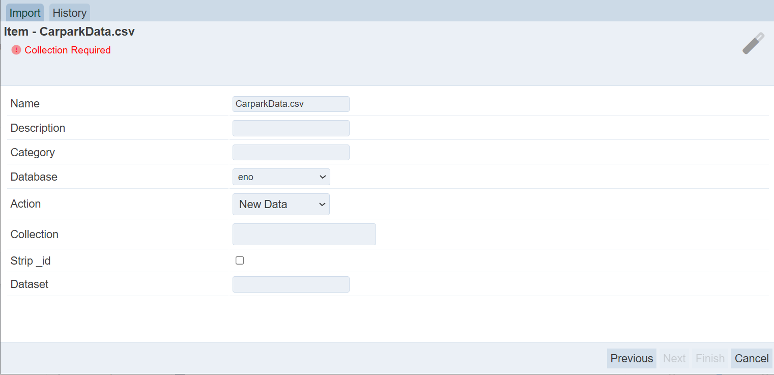 Key in a brief description for the data (optional) in the “Description” field. Select the desired database from the drop-down list for the “Database” field and select if it is a new data, append data or overwrite data in the “Action” field. In the “Collection” field, key in the collection name of the data. If the name already exist, an error message will appear. If “Append Data” or “Overwrite Data” is selected in the “Action” field, select the desired collection from the drop-down list in the “Collection” field. If the "_id“ is not desired to be included in the data, select the ”Strip _id“ field. Key in the name of the dataset in the ”Dataset" field.