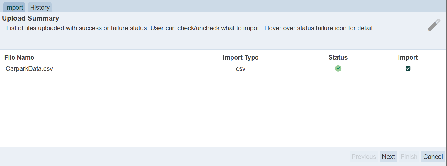 Once the upload is completed, the data file or the list of data files (if a zip file is selected) will be displayed. By default all data files are selected. You can choose which data file to upload by deselecting the unwanted data files under the “Import” column.