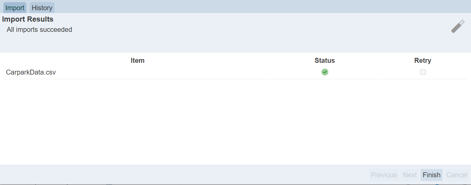 Upon successful import, the “Import Result” will be displayed in the page. A green tick indicates a successful import in the “Status” column, while a red cross indicates unsuccessful import. You can select checkboxes of the unsuccessful items under the “Retry” column and click on the “Next” button to retry the import again. Click on the “Finish” button to exit back to the Import page.