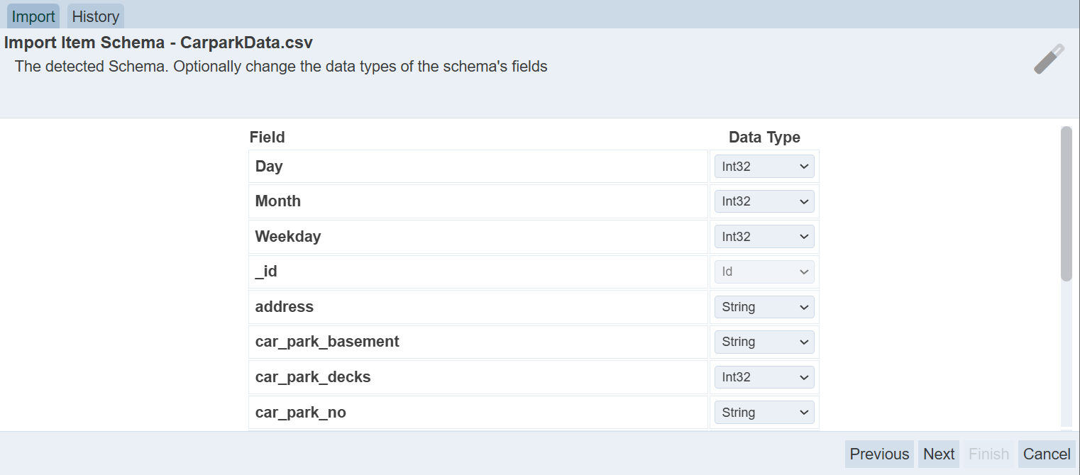 In this page, you can change the data types of the schema fields by selecting from their respective drop-down list. Click on the “Next” button after all choices are made.