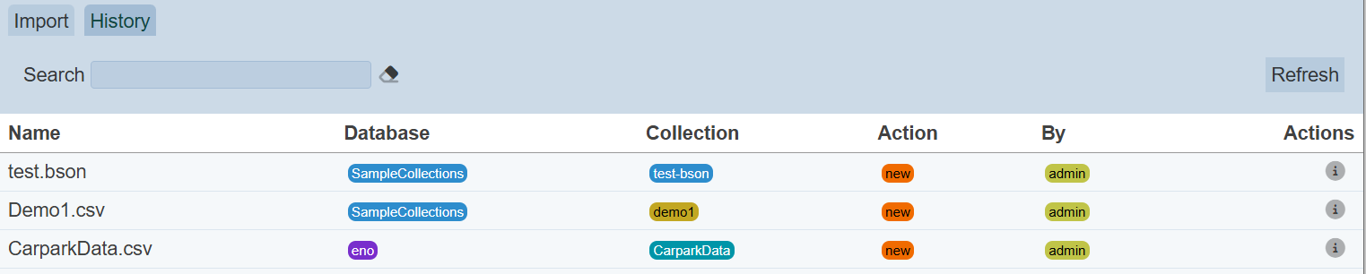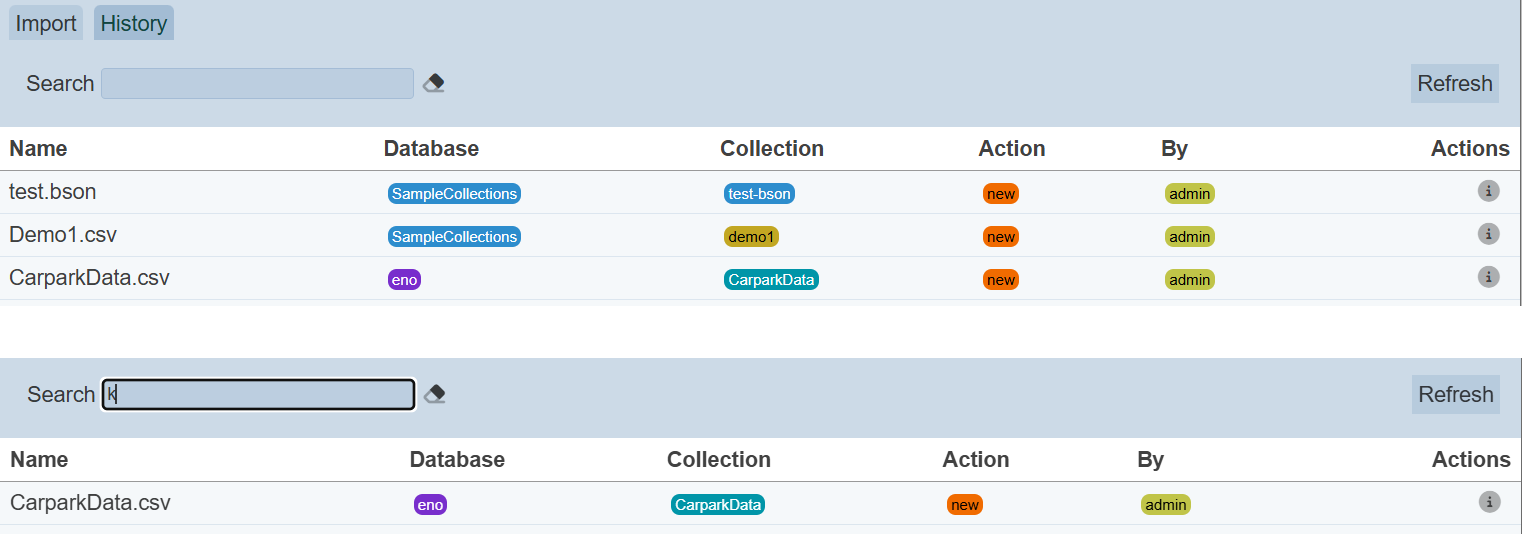 Alternatively, you can click on the any item under the “Database”, “Collection”, “Action” or “By” columns respectively to aid the search for the imports in the page.
