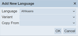 In the “Language” field, select the desired language from the drop-down list. Select the desired variant for the selected language from the drop-down list in the “Variant” field. In the “Copy From” field, you can either copy from an existing translation or create a blank translation by selecting blank option from the drop-down list. Click on the “OK” button to add the new language or click on the “Cancel” button to abort the action. Do note that a language (with a particular variant) can be added only once.