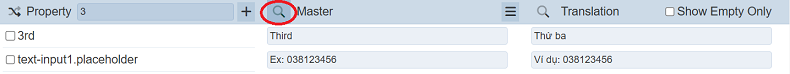 The search function allows you to conduct a search in the Property, Master and/orTranslation panels.