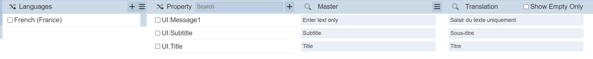 This provides an easy way to search through the list of translations. It is case-insensitive and displays files that have the entered search value in any of the values of the fields below: