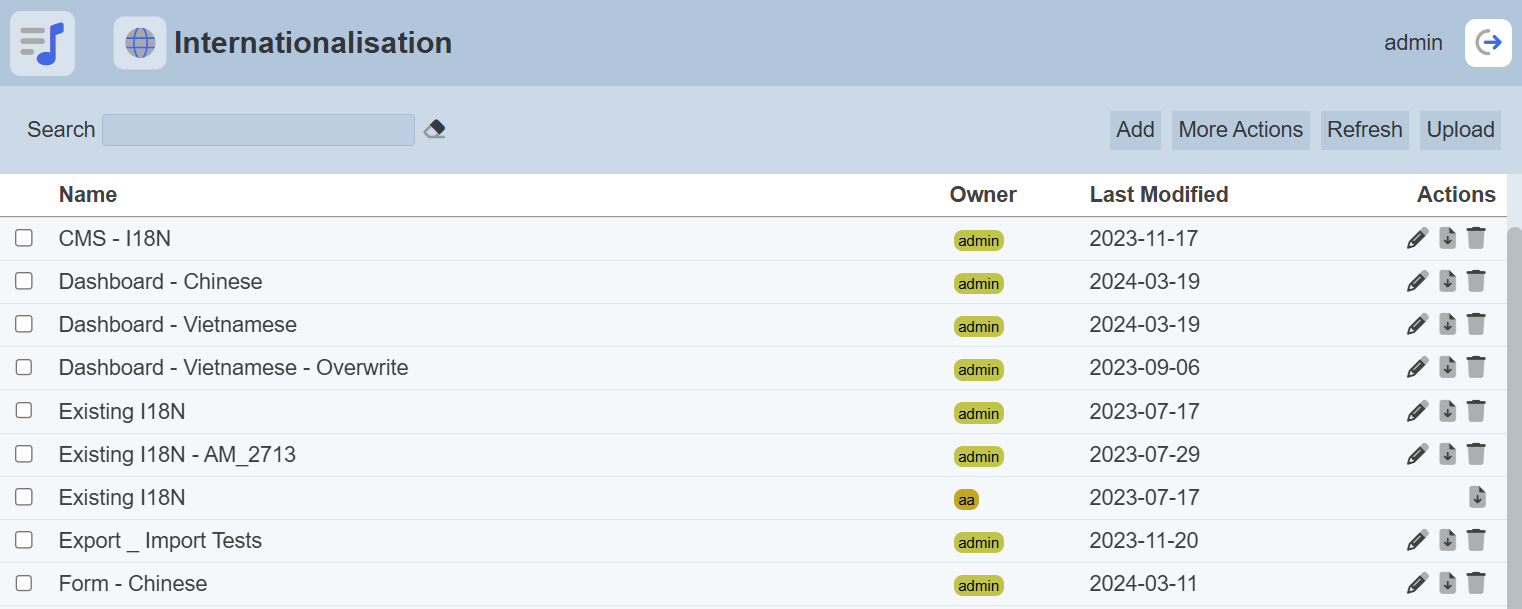 The Internationalisation (I18N) module allow users to create translations for other Ambience modules, such as the Form module, etc. Users can now provide localized versions of text and content.