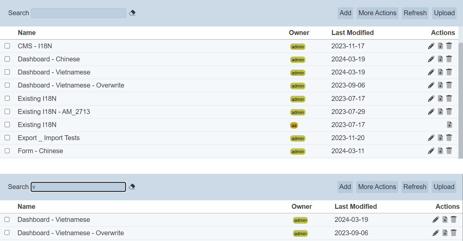 | Download | Downloads multiple translations as a zip file. If only one translation is selected, the selected translation will be downloaded as a JSON file. |