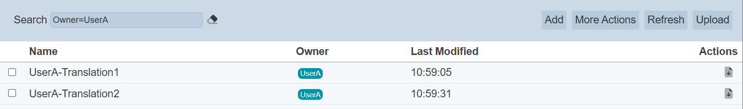 In the example above, translations that are owned by “UserA” are shown.