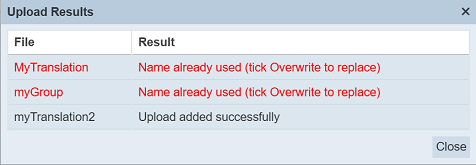 If the translation to be uploaded is to replace an existing one, select the “Overwrite” field. Click on the “OK” button to upload the translation. Click on the “Cancel” button to abort the action.