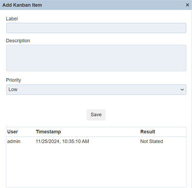 icon at the bottom of the desired column. The “Add Kanban Item” dialog box will appear. The content of the dialog box is actually the content of the form that was defined in the Kanban board.