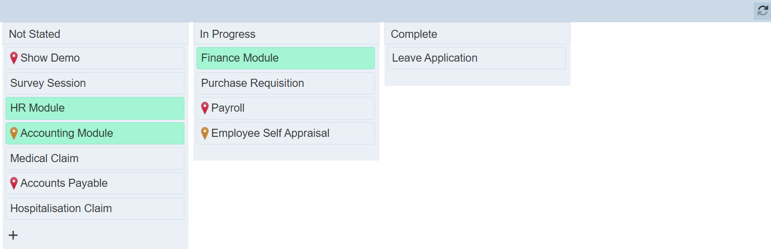 “Refresh” icon at the upper right corner of the Kanban board page. It is particularly useful if there are more than one user editing and making changes to the Kanban items.