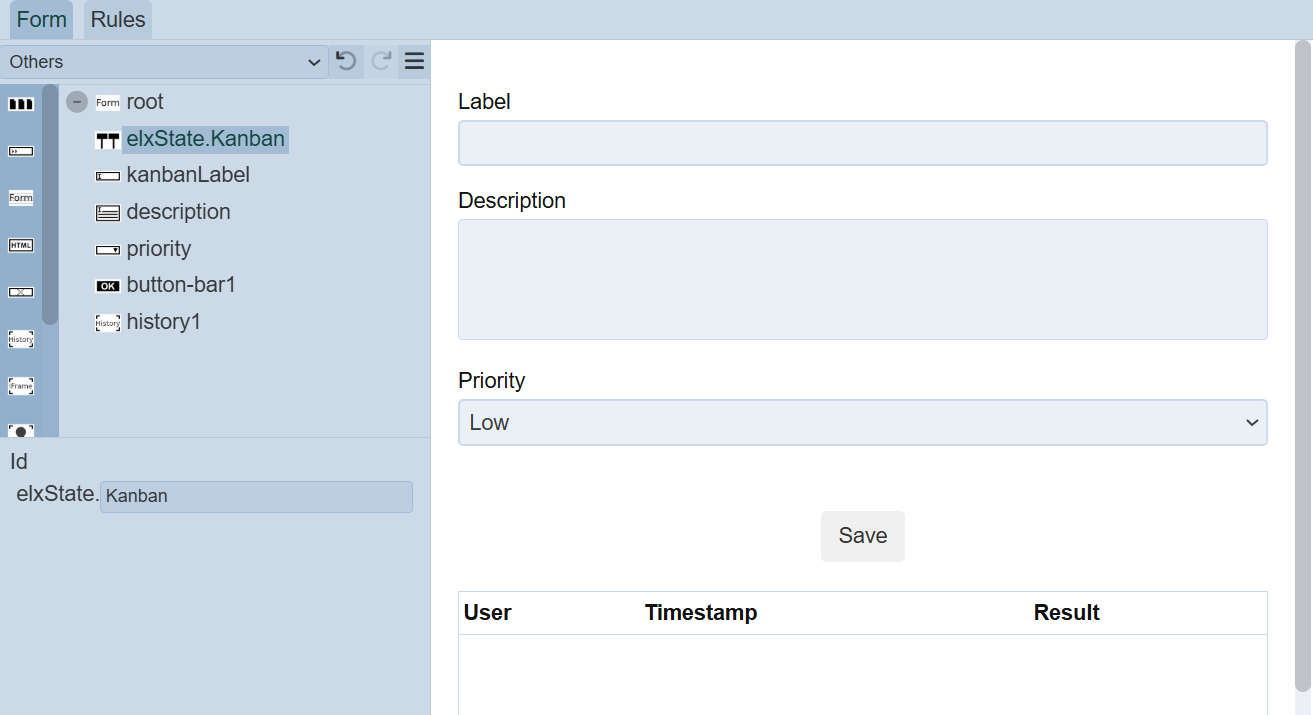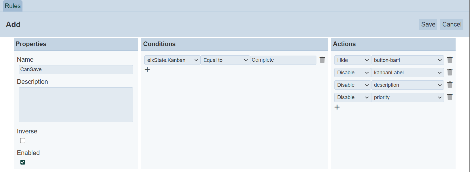 The condition is that when the elxState.Kanban is in the Complete state, the actions listed in the “Actions” panel will apply. The actions are to hide the “Save” button and disable the “Label”, “Description” and “Priority” fields in the form.