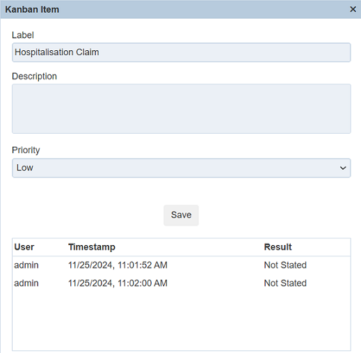 You can edit the Kanban item by clicking on item itself to display the “Kanban Item” dialog box. The History component in the form will capture the actions done with the form.