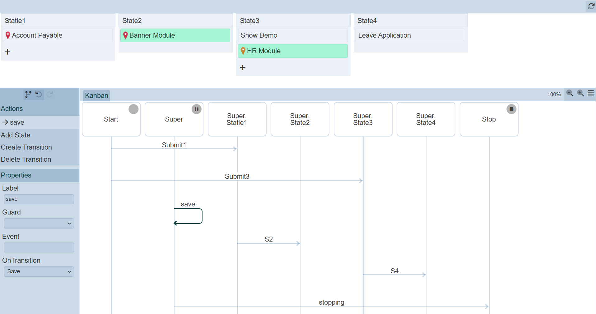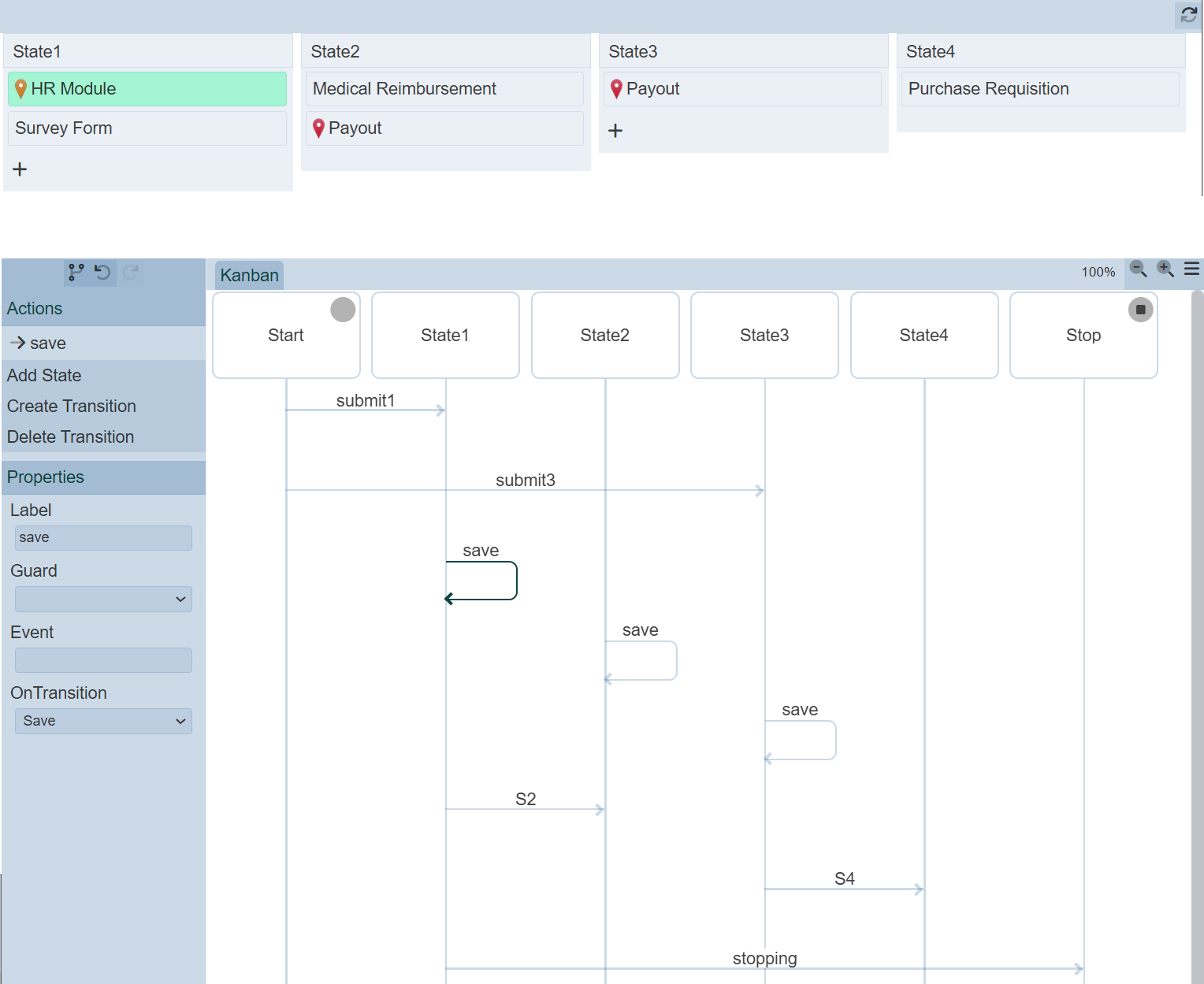 In the example below, “State1” and “State3” are linked to the “Start” state with “Submit1” and “Submit3” transitions respectively. Transition “S2” links “State1” to “State2”, thus Kanban items in “State1” can be moved to “State2” but not the other way around. The same goes for transition “S4” which links “State3” to “State4” states.