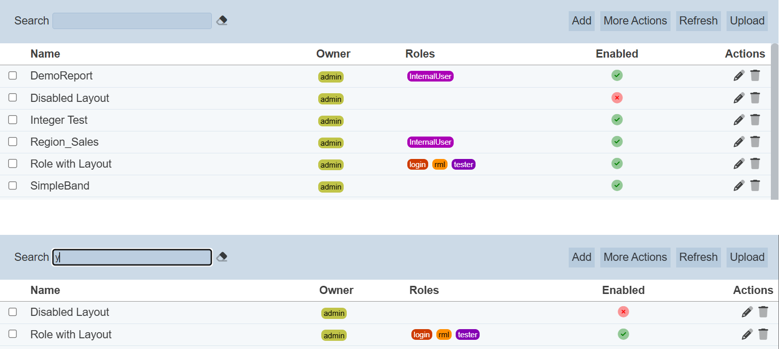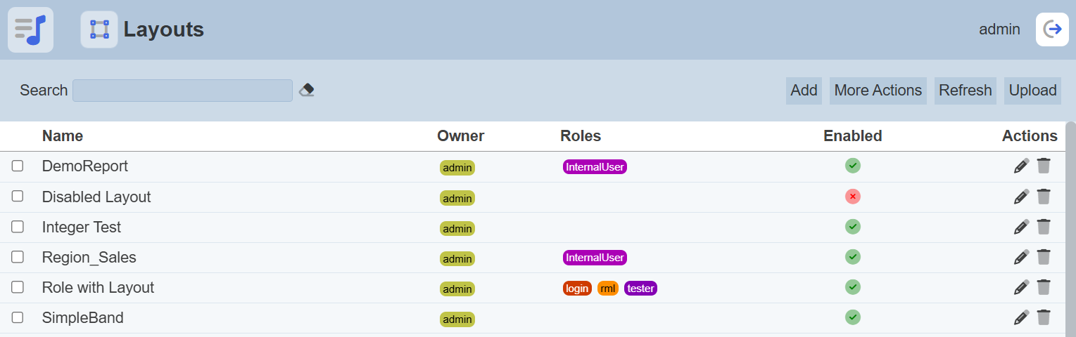 To enable or disable the layouts, click on the “More Actions” button and select the “Set Enabled True” or “Set Enabled False” option respectively.