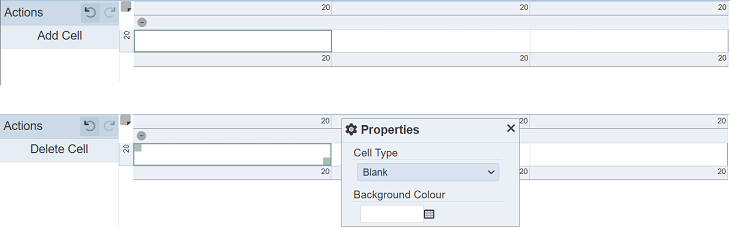 The actions available for cell is add, delete and edit. The default layout does not have any cell in its row and column. A cell can be added onto the layout. with its the cell type and properties defined. The number of cells that can be added is the multiple of rows by columns. Two or more cells can be merged together as well.