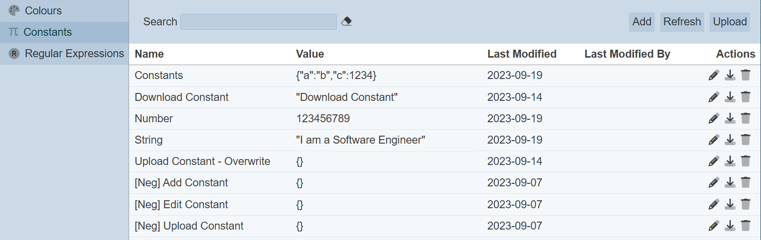 To delete a constant, click on the “Delete” icon under the “Actions” column of the corresponding constant.