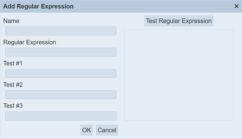 Key in an unique name for the regex in the “Name” field. In the “Regular Expression” field, key in the expression in the textbox. In the “Test #1” to “Test #3” fields, key in the values to test on the regex. These fields are optional.