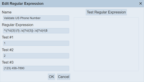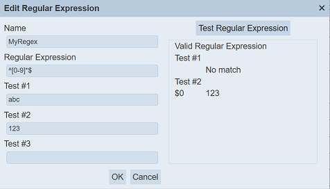 | Valid Regular Expression | Shows test results of the values in Test #1 to #3 on the regex. | Textbox | None |