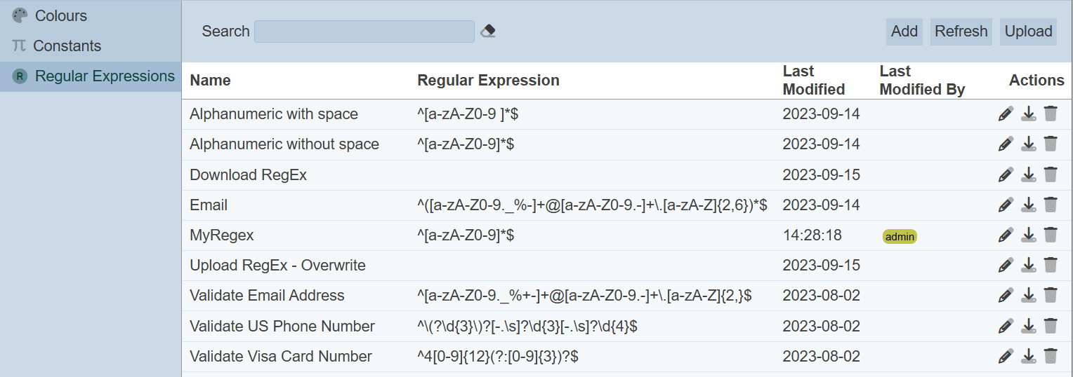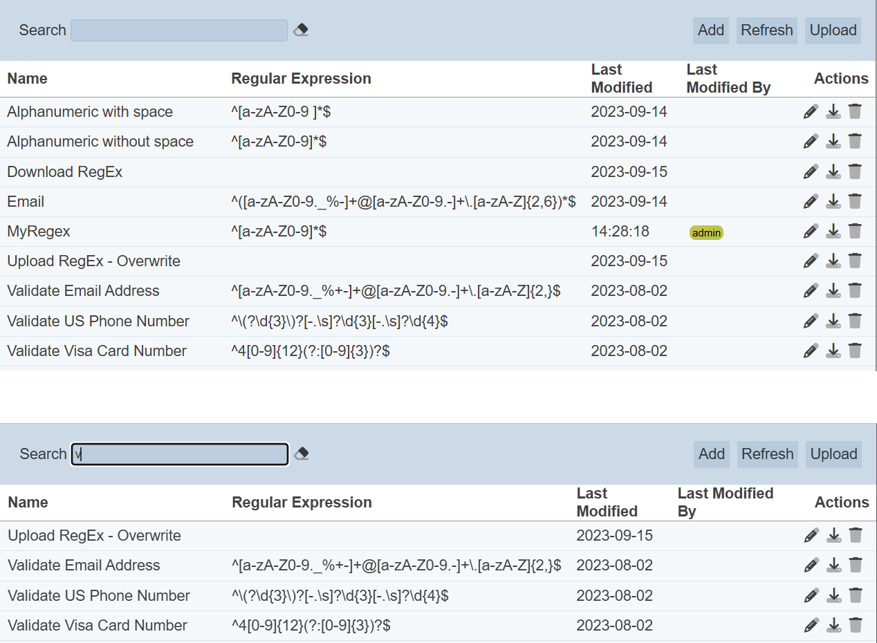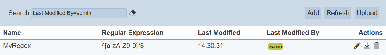After performing actions on the browser, the list is reloaded to display the list of regex. The manual “Refresh” button is available and is particularly useful if there are others making changes on the same page.
