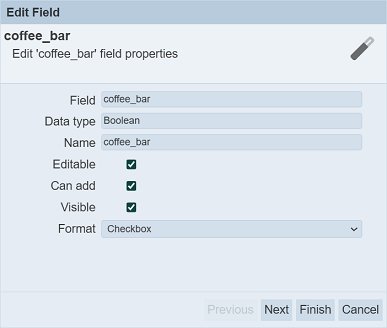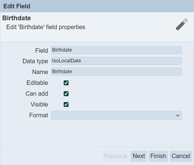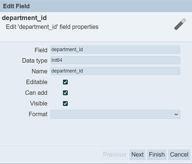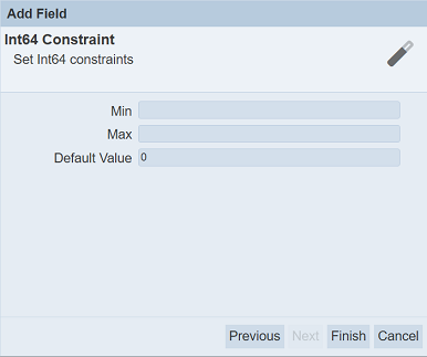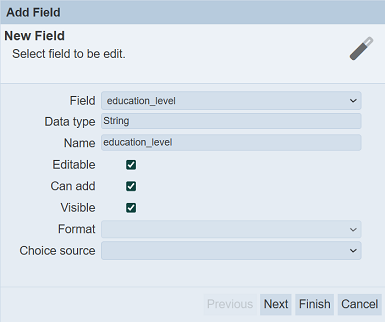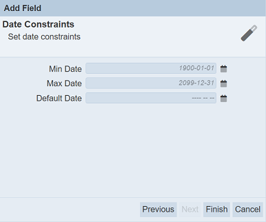 Click on the “Finish” button to add the field. Clicking on the “Previous” button (if available) bring you back to the previous screen. Click on the “Cancel” button to abort the action.
