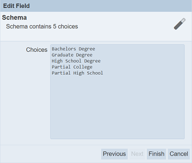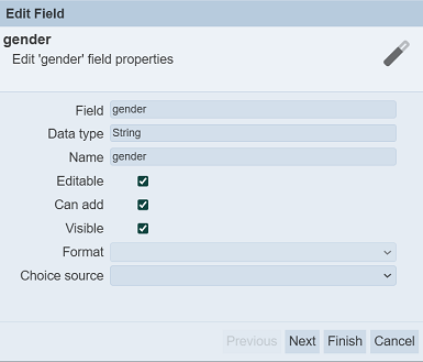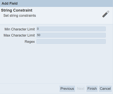 In the “Edit Field” dialog box, make the necessary changes. Click on the “Next” button and edit the “String Constraint” fields (if applicable). Then click on the “Finish” button to save the changes.