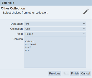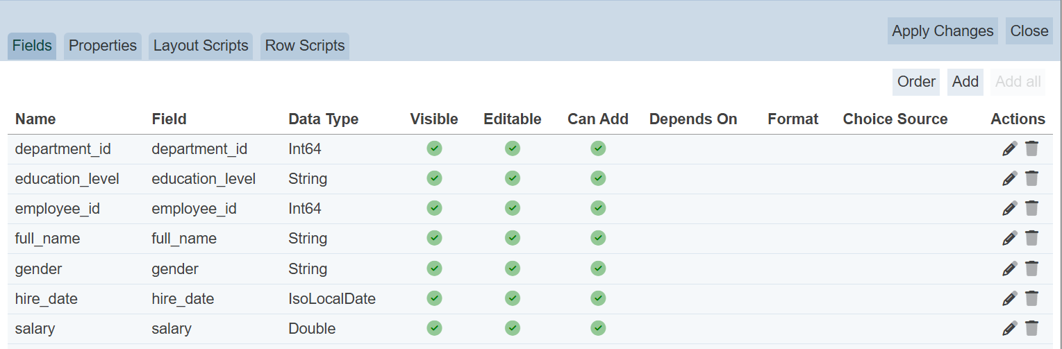 Select the desired field from the drop-down list in the “Field” field. Change and edit the other properties as desired. The “Editable” is disabled and unselected for the _id field of the dataset.