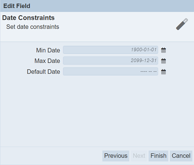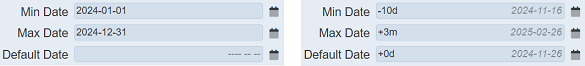 | Default Date | Defines the default date. | N | Text field or Date picker | Date must be within the the default value of “Min Date” and “Max Date” fields. | Empty |