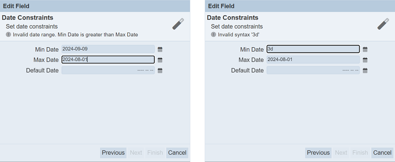 If the date entered is incorrect or the syntax is wrong, an error message will appear in red above the fields.