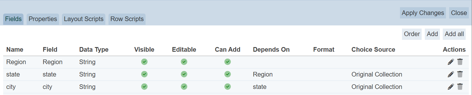 In the same way, the values for city will be limited to those that belongs to state field. In this example, city depends on state and state depends on Region. If the “Depends On” field is not selected, all values for city and state will be available for selection, regardless of the value selected from other fields.