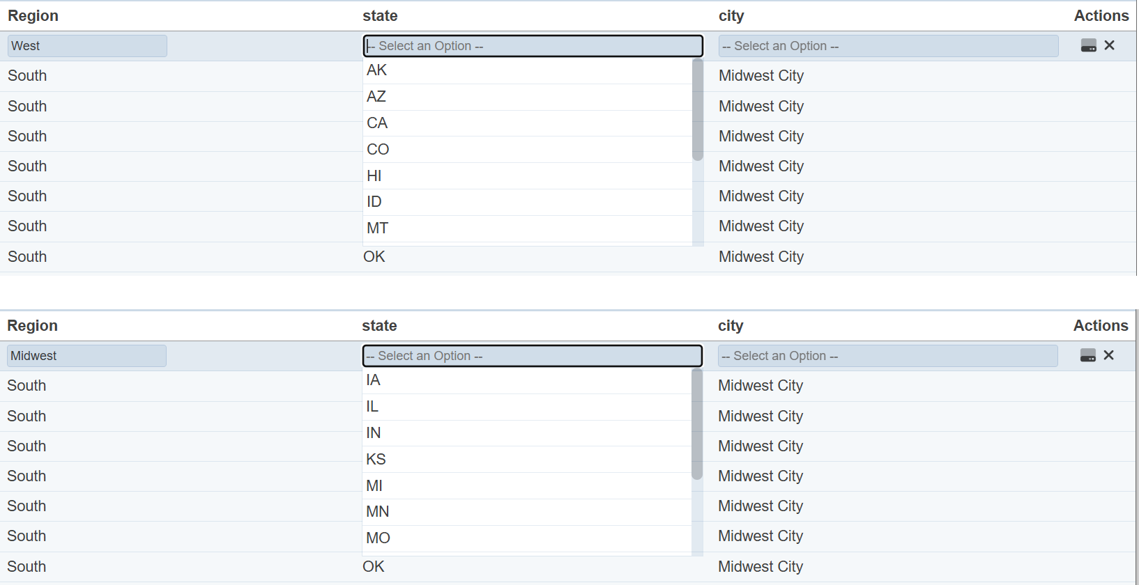 When adding new records, depending on the value selected in the Region field, the values for state will be limited to those that belongs to the value selected in Region. In the screenshot below, West is selected in Region field, the values in the state field are those that belongs to West. When Midwest is selected in Region field, another list of values will appear in the state field.