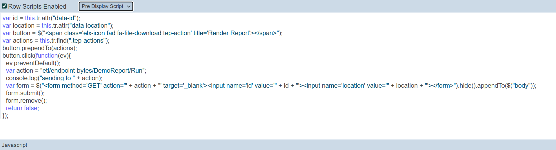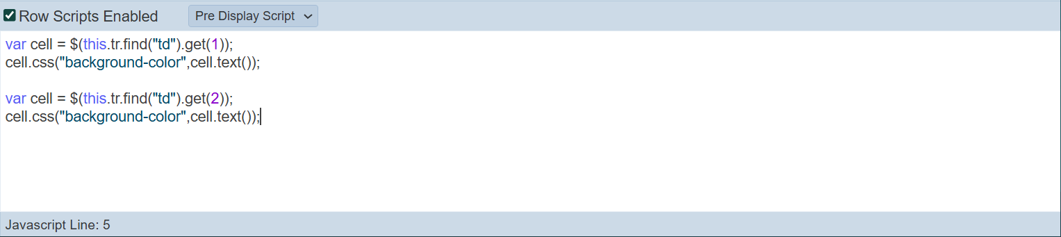In the Row Scripts tab, select “Pre Display Script” and enable row scripts by selected the checkbox next to the “Row Scripts Enabled” field. Key in the script code and click on the “Save” button to change the edit.