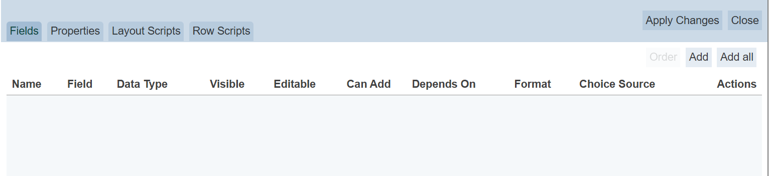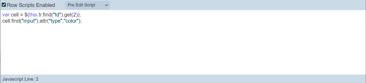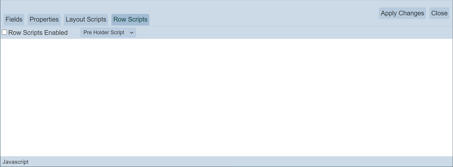 The “Row Scripts” tab allows you to add scripts to customise the record editor for each individual editable cell.