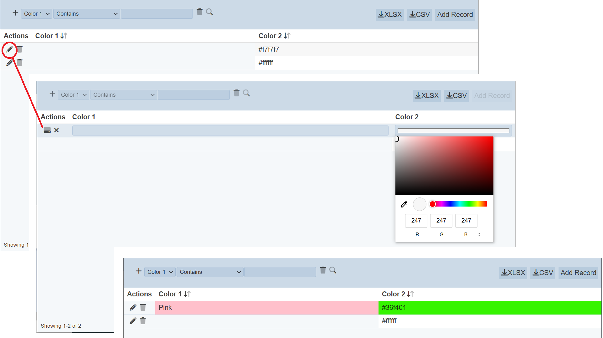 “Edit” icon under the “Actions” column for a row, the cell under “Color1” is empty, so no colour is displayed while “Color2” displays the colour as defined by the code in the cell. Click onto the cell of “Colour1” and key in a colour, in this example, Pink is used. Click onto the cell of “Color2” and the colour chooser appears. Choose the desired colour, in this case, green is selected. Click on the “Save” icon and the cells now display the colour selected.