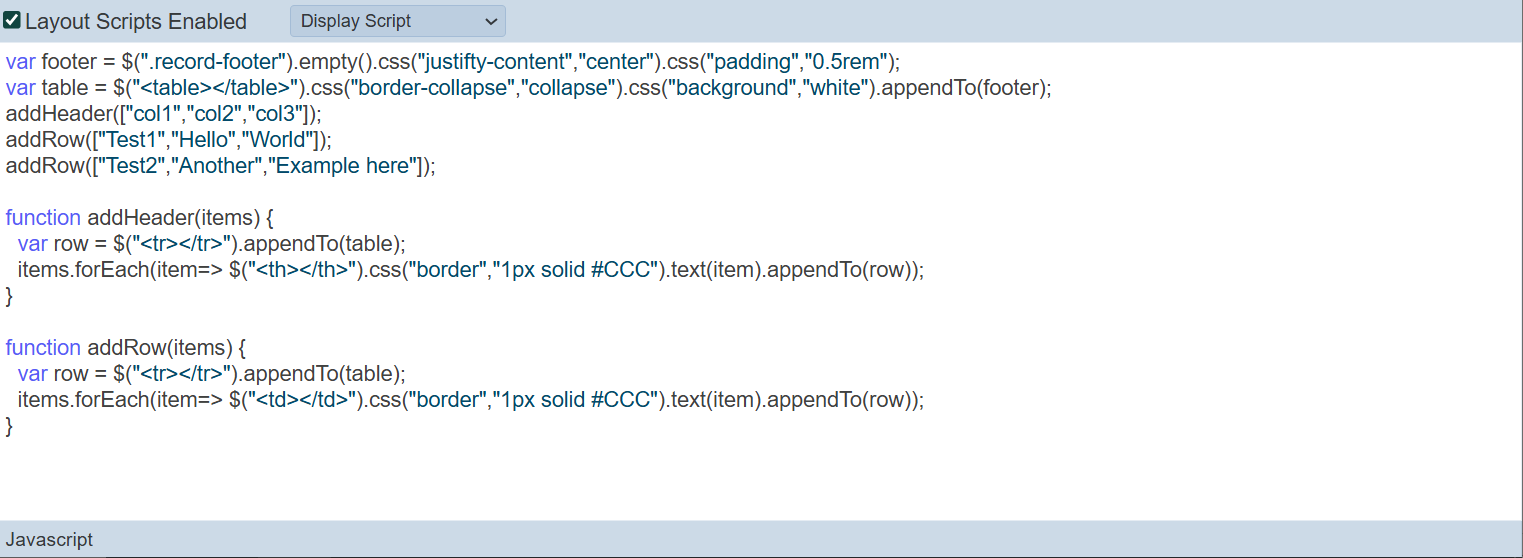 To do so, in the “Layout Scripts” tab, select “Display Script” from the drop-down list and key in the following code.