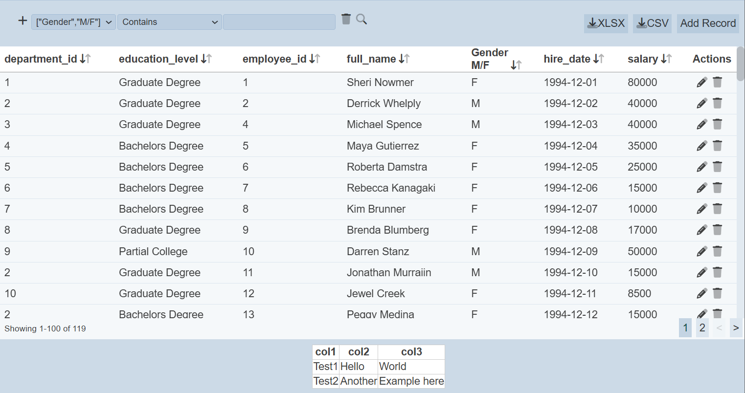 In this example, the data has two columns; namely “Color1” and “Color2”. “Color1” shows the name of the colour it holds and “Color2” shows the code of the colour it holds. But both does not show the colour in the cell, making it difficult to To allow the user to change the colour easily, “Pre Display Script” and “Pre Edit Script” can be used to display the color selected.