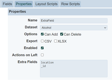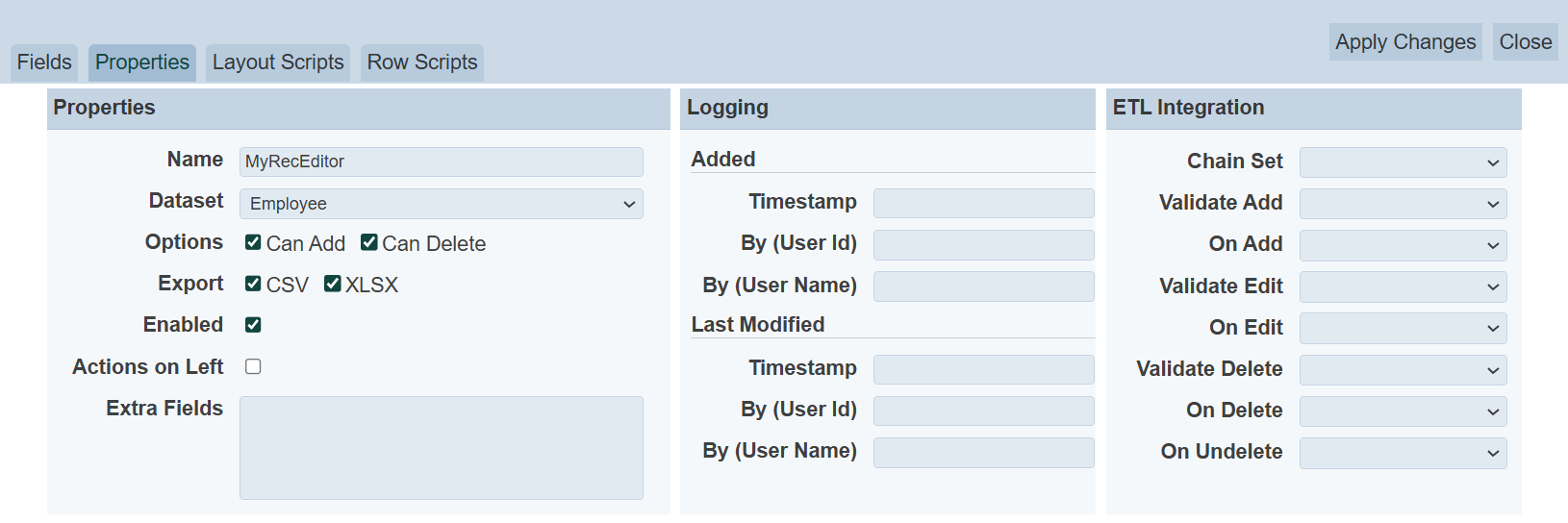 | Options | Consists of three selections. If selected, allows user to add, delete and/or enable the record editor. Available options: - Can Add - Can Delete - Enabled |