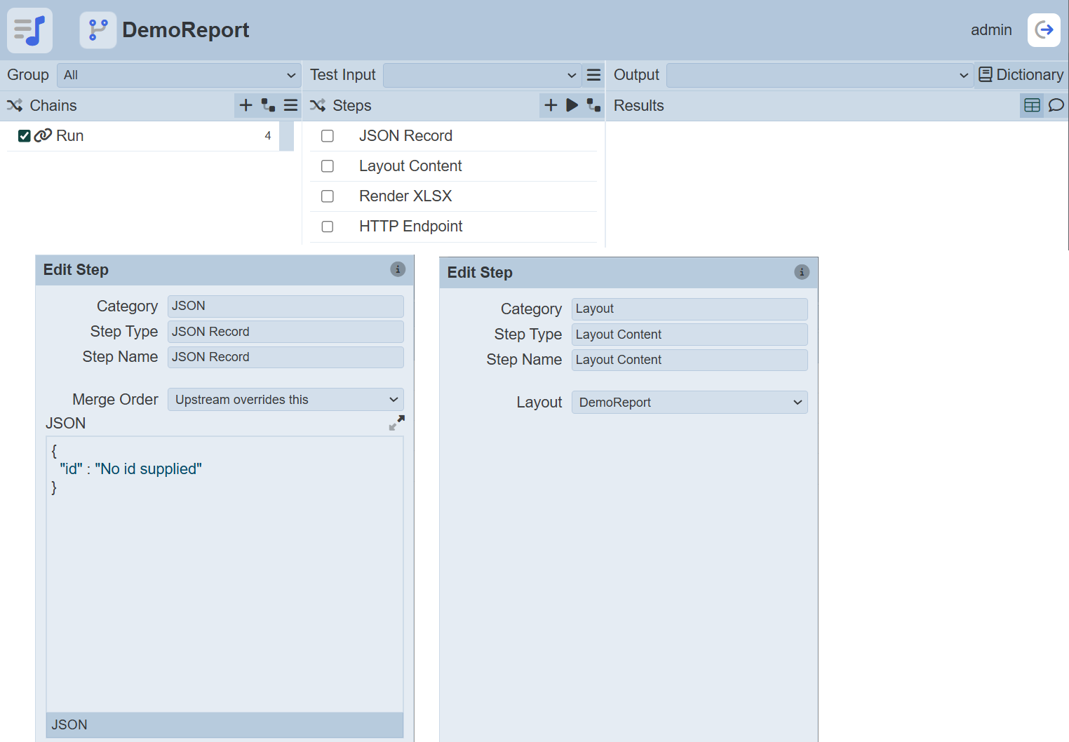 In the ETL module, create an ETL chainset with the following ETL steps and settings: