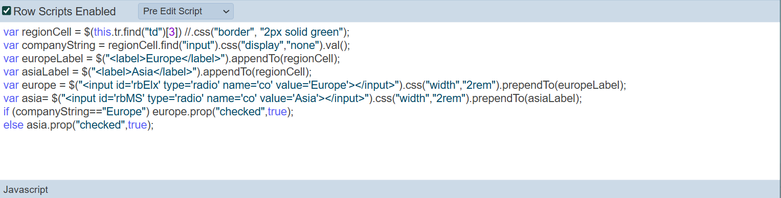 The code in the “Pre Edit Script” access the Region field and displays the options as radio buttons instead of textbox. It allows for the user to select when the