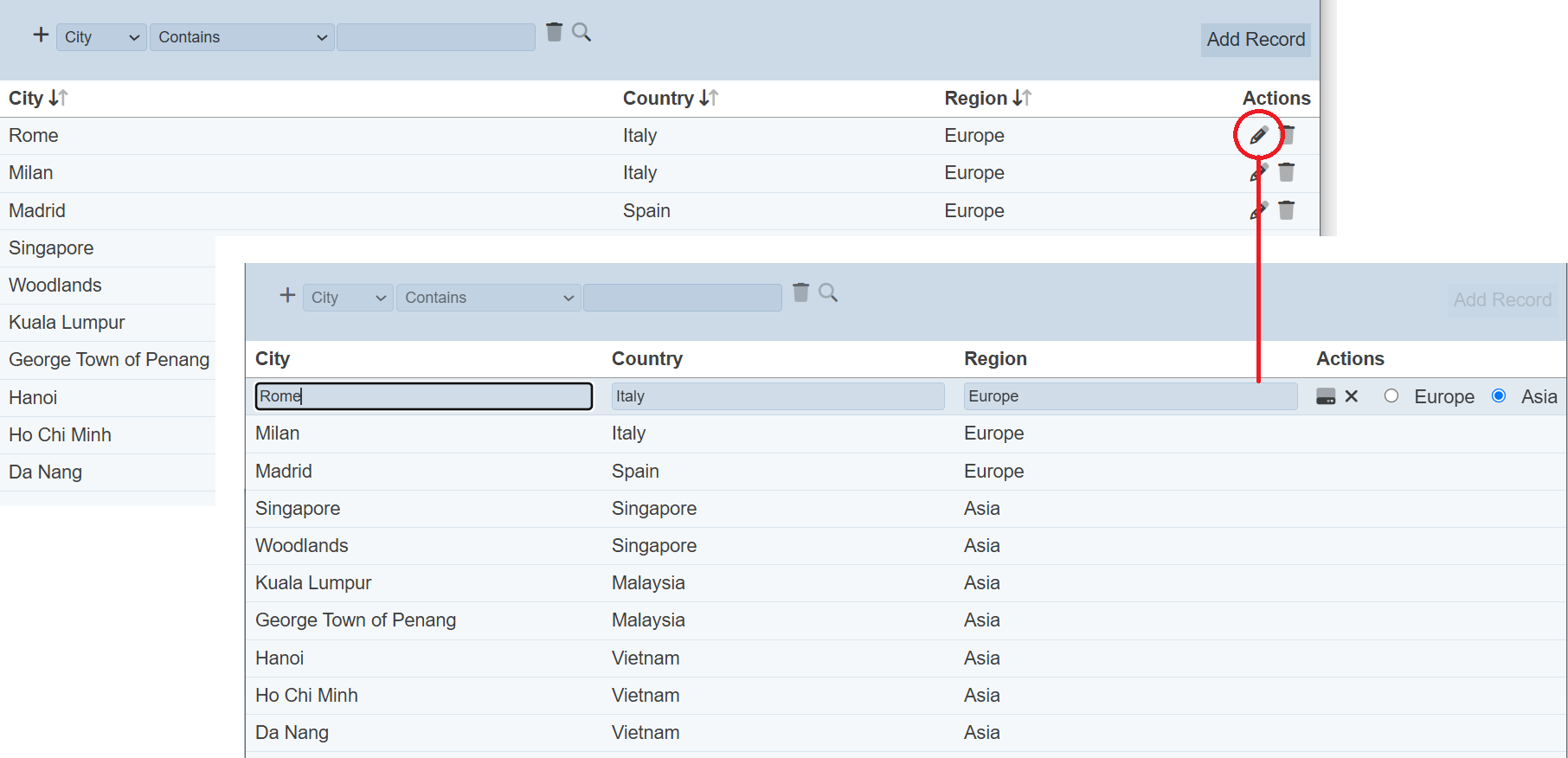 “Edit” icon under the “Actions” column for a row, the options defined in the “Pre Edit Script” will appear as radio buttons. Without the code, a textbox will appear for the “Region” field as per “City” and “Country” fields.