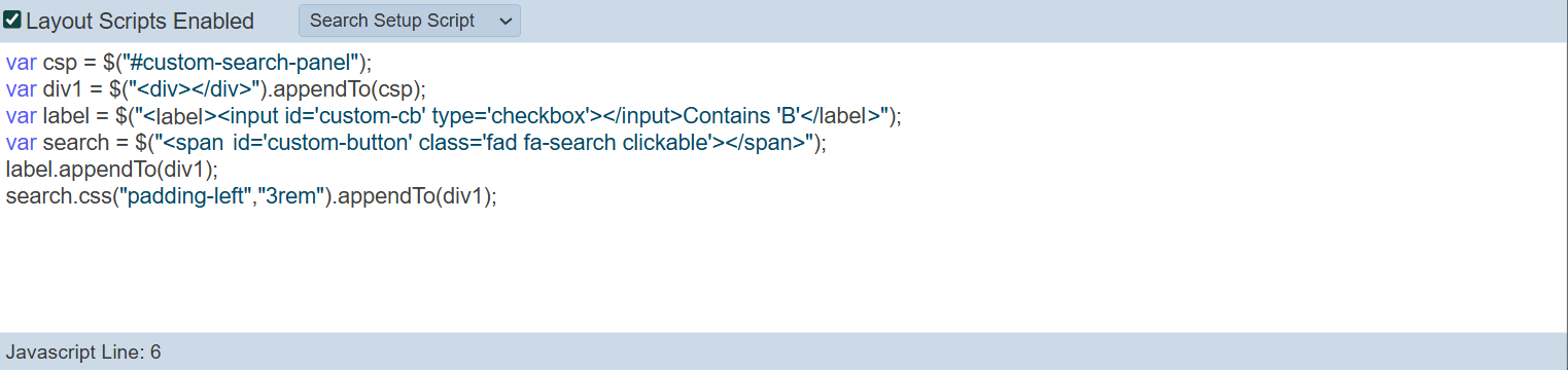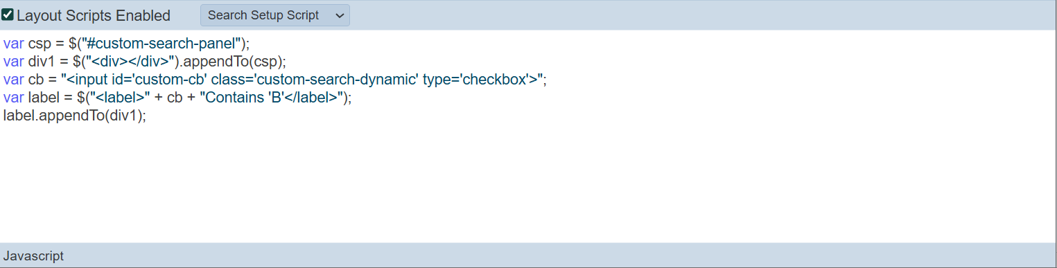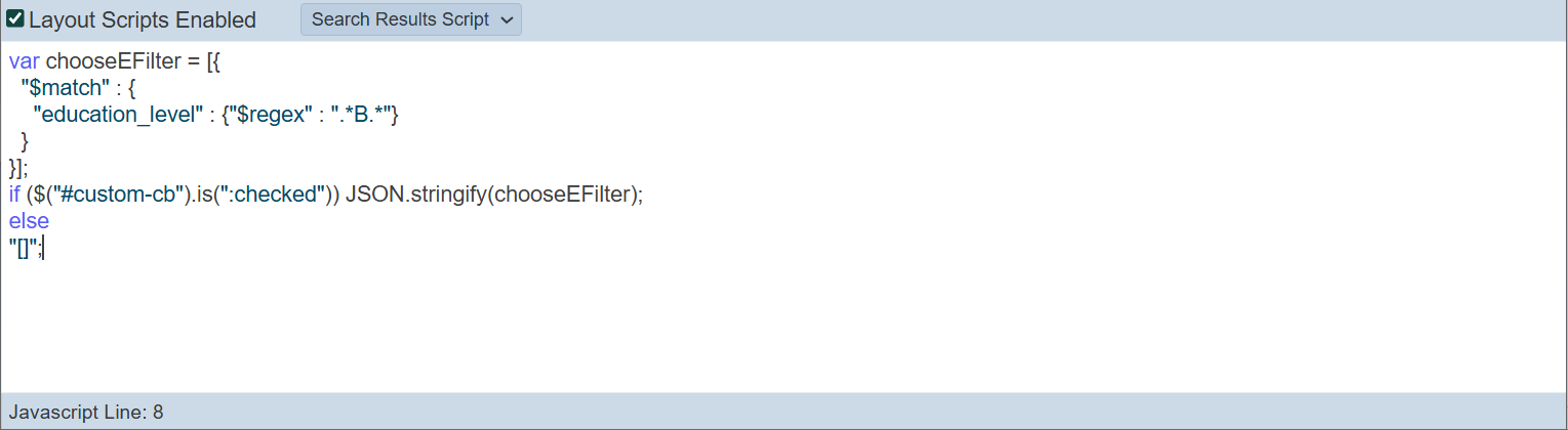 Below is an example of customising a search for records in “education_level” that has a “B” in it. For the “Search Setup Script”, the code is as shown below.