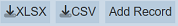 The “Export” field allows the user to export the record editor in the selected options (either in CSV and/or XLSX format). The Record Editor will display the buttons for the selected options that the upper right corner of the page.